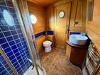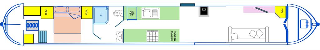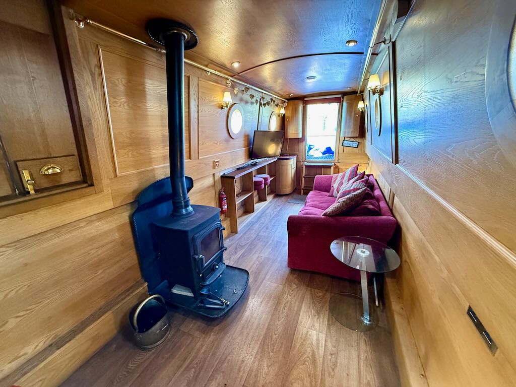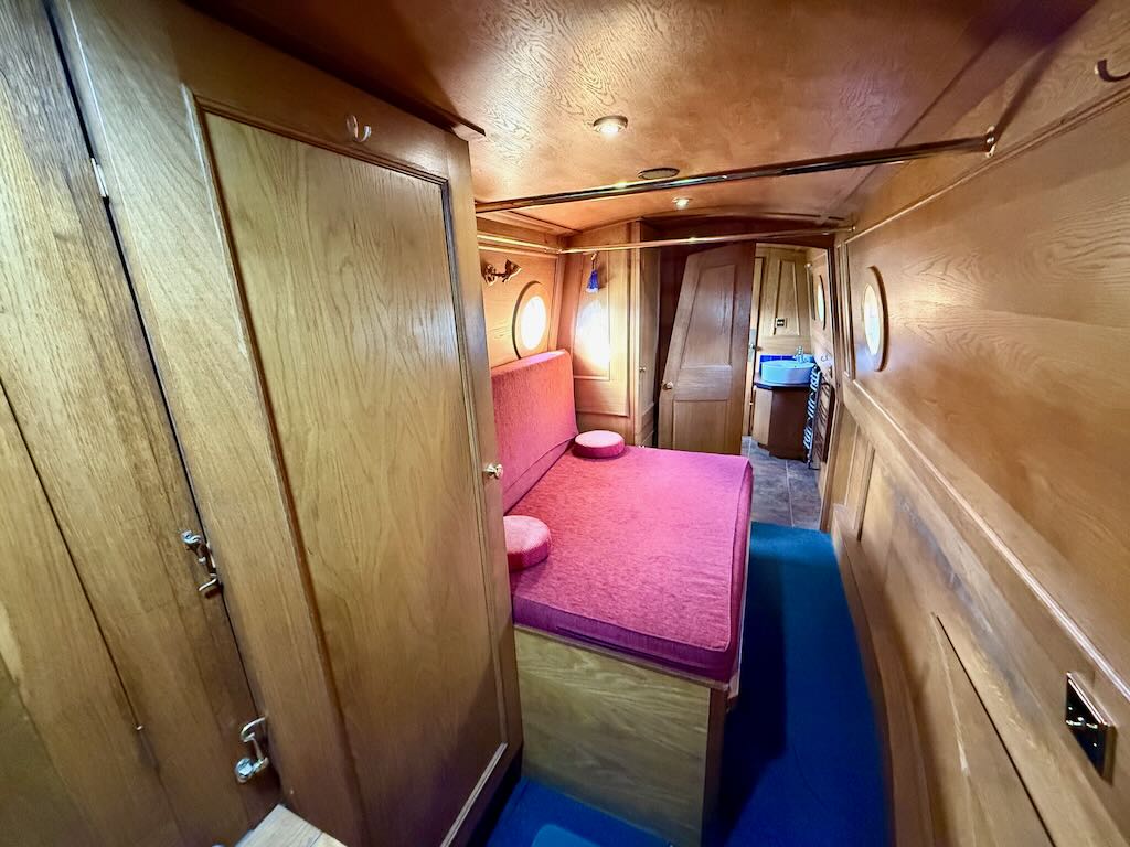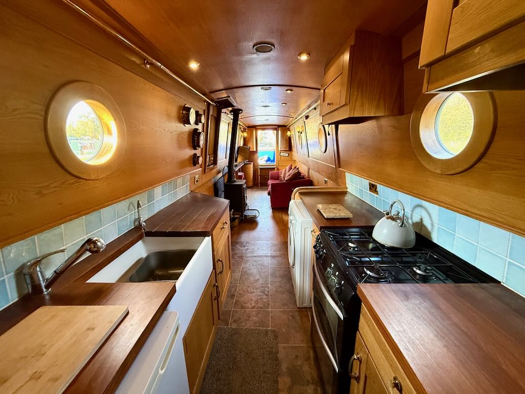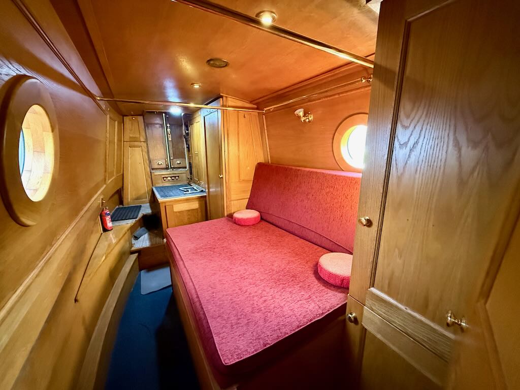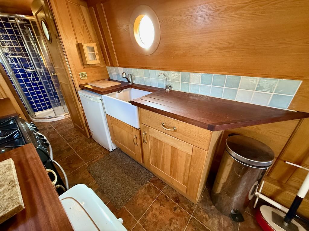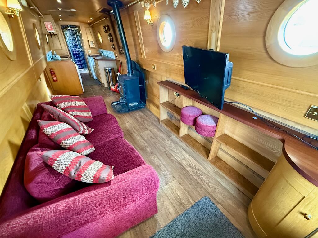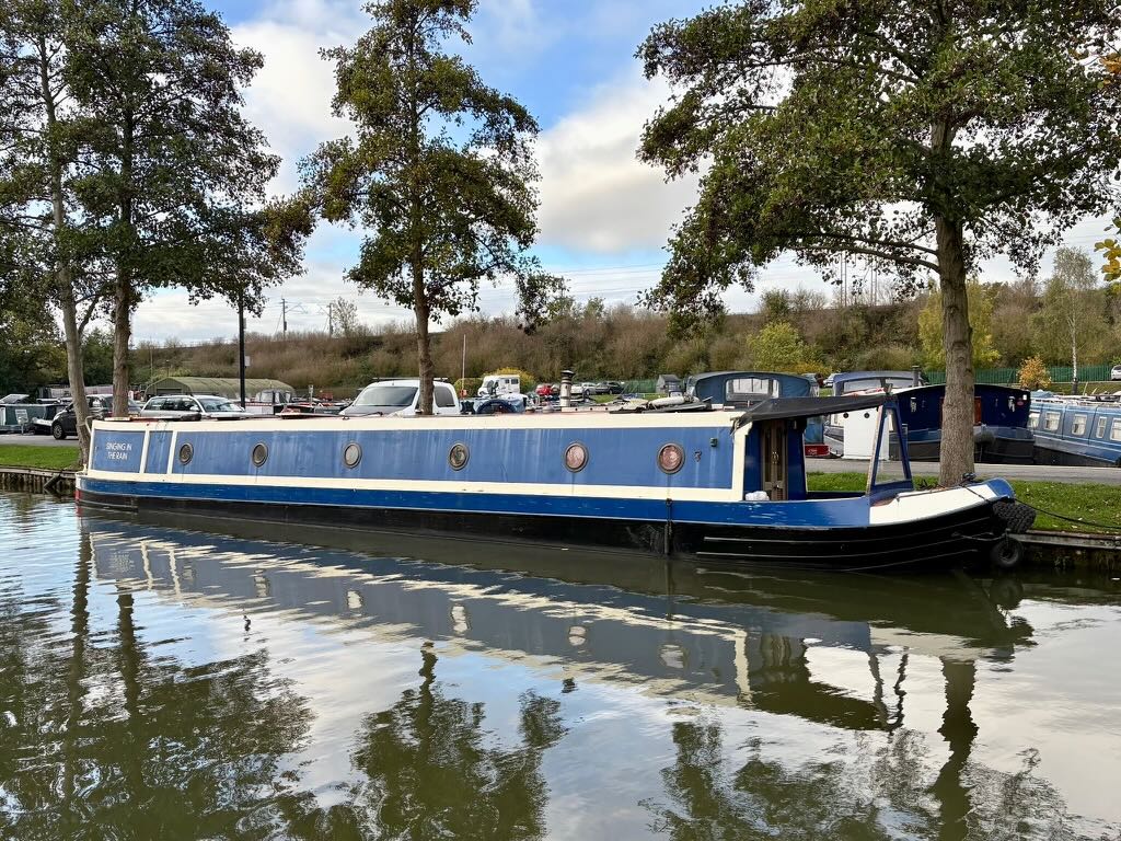 Singing in the Rain is a beautiful 2 berth, 57ft traditional style narrowboat, built in 2005 by Jonathan Wilson. She features a large saloon with sofa and stove, a galley with cooker, fridge and washing machine, a walkthrough bathroom with shower, toilet and vanity basin, and a cross double bed at the stern.