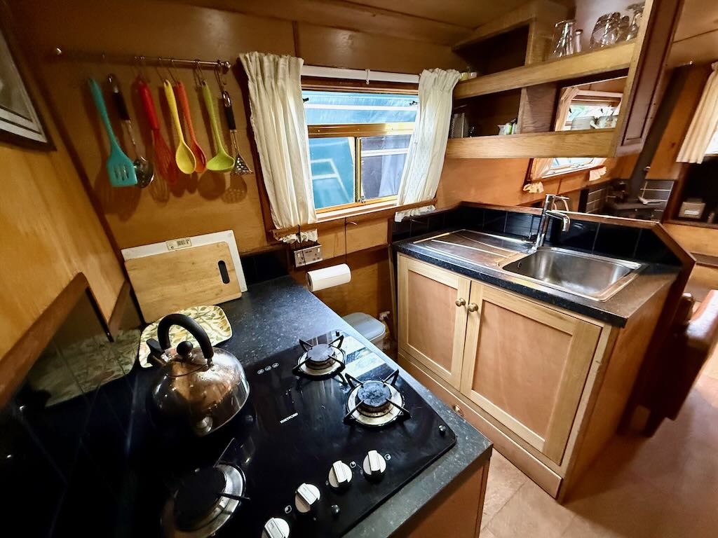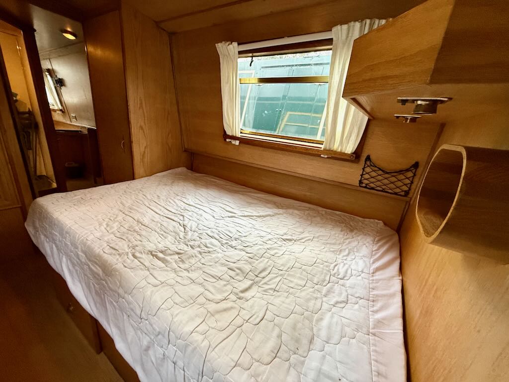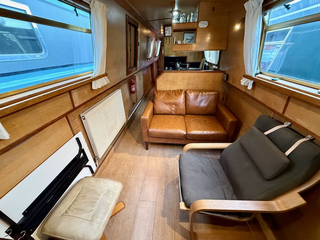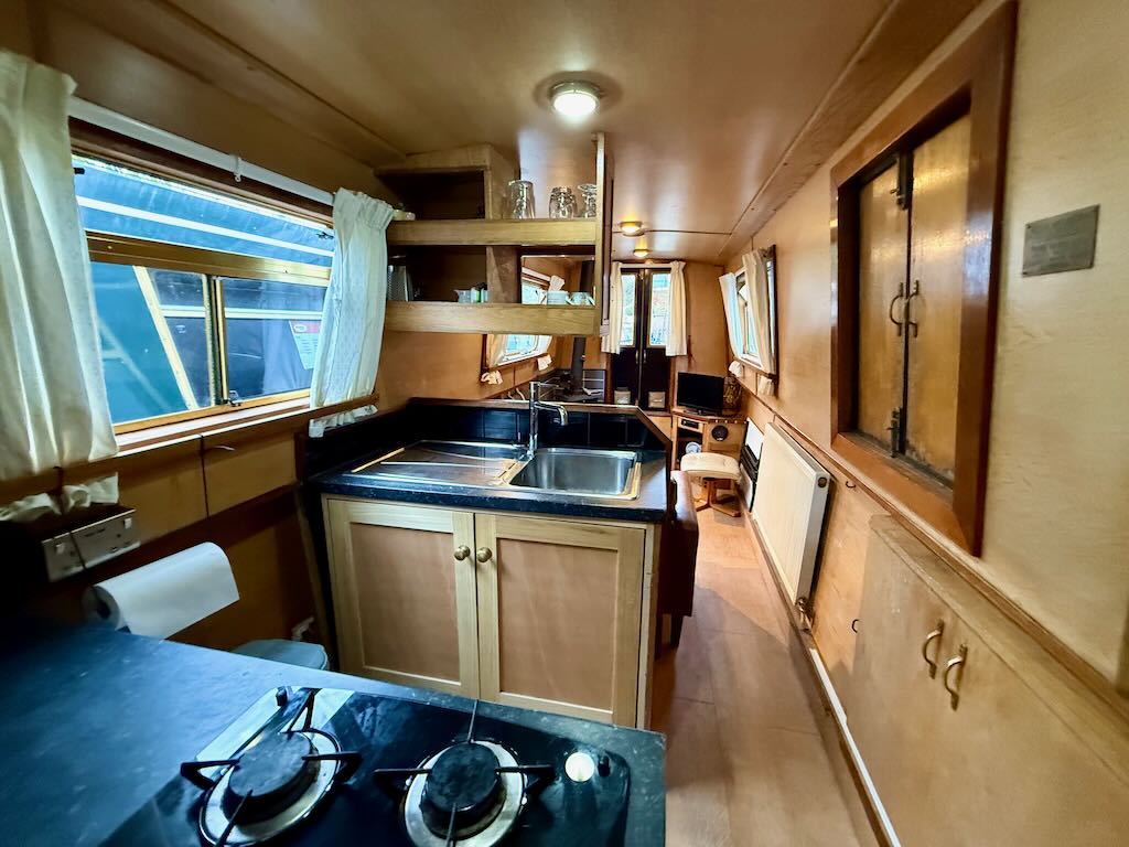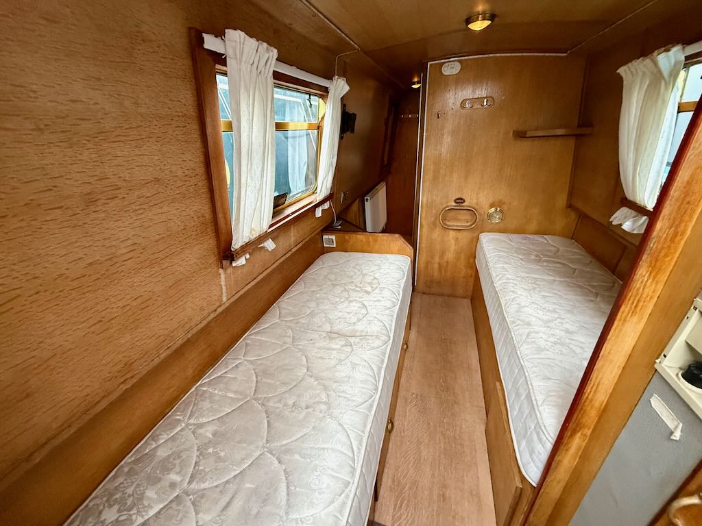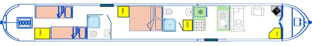 Tara is a 4 berth, 58ft cruiser style narrowboat, built in 2003 by Wessex Narrowboats. She features a saloon with sofa and stove, a galley with cooker and fridge, a bathroom with shower, toilet and vanity basin, a fixed double bed, a further bathroom and then 2 fixed single beds at the stern.