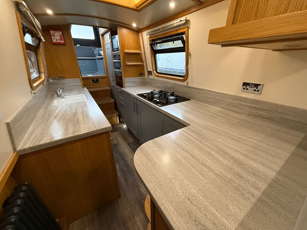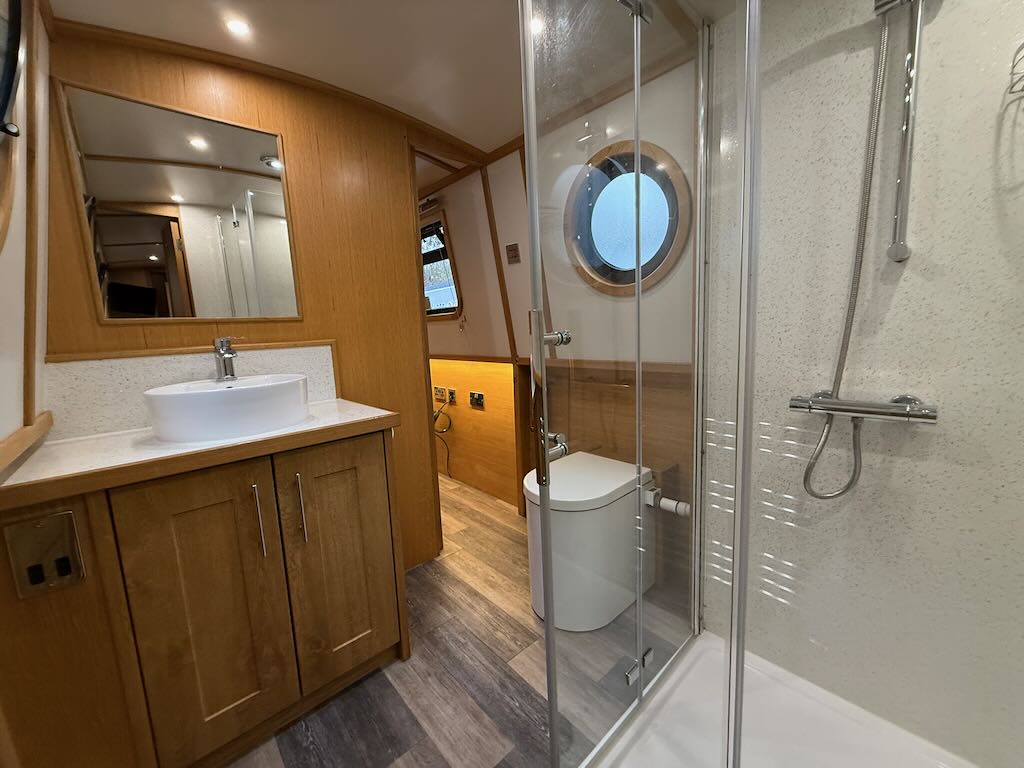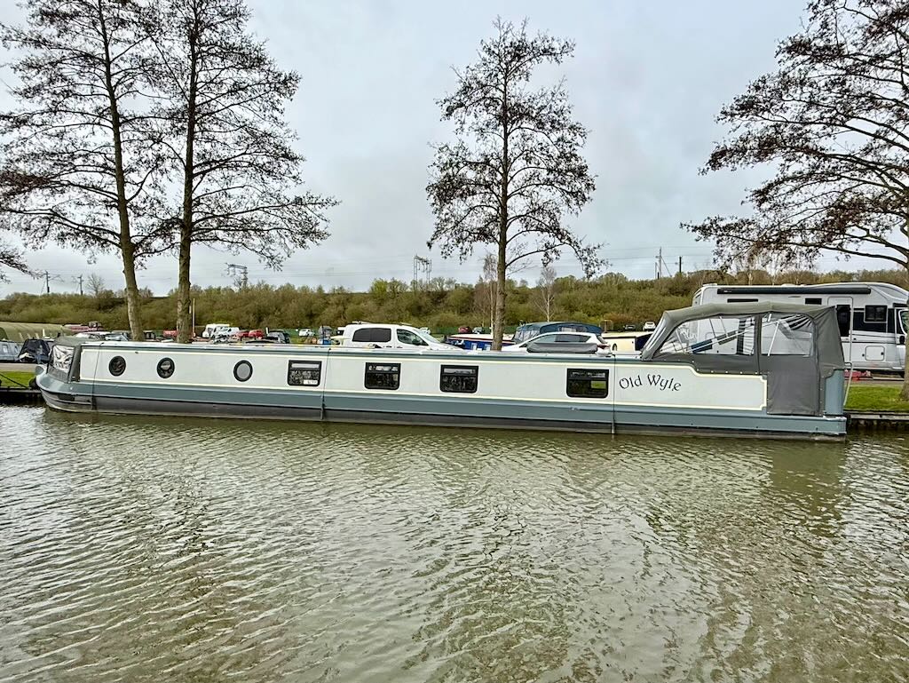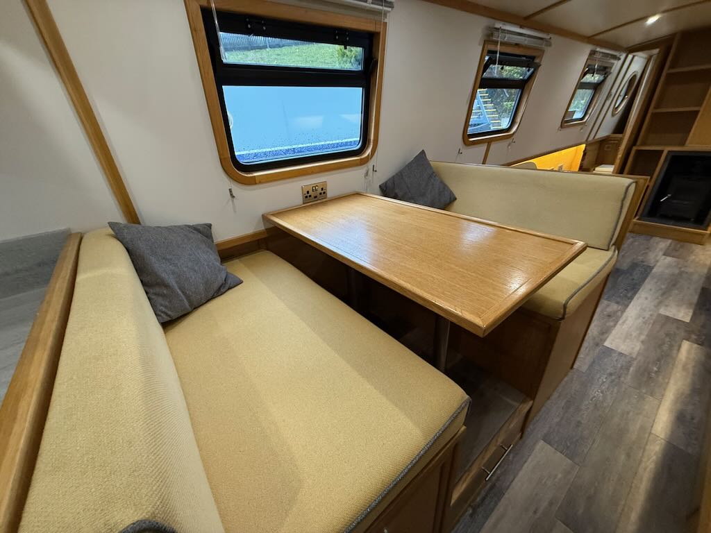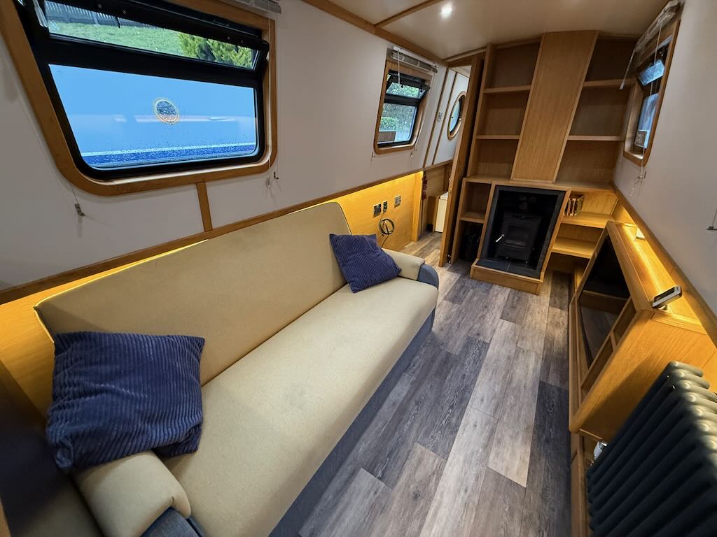Old Wyle is a 6 berth, 62ft cruiser style narrowboat, built in 2021 by Bluewater Boats. She features a reverse layout with the galley at the stern, a dinette that converts to double bed, saloon with sofa bed and stove, walkthrough bathroom with shower, toilet and vanity basin and a cross double bed a the bow.