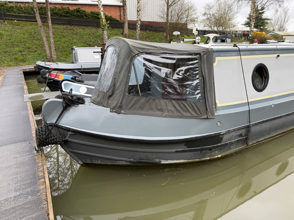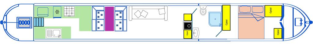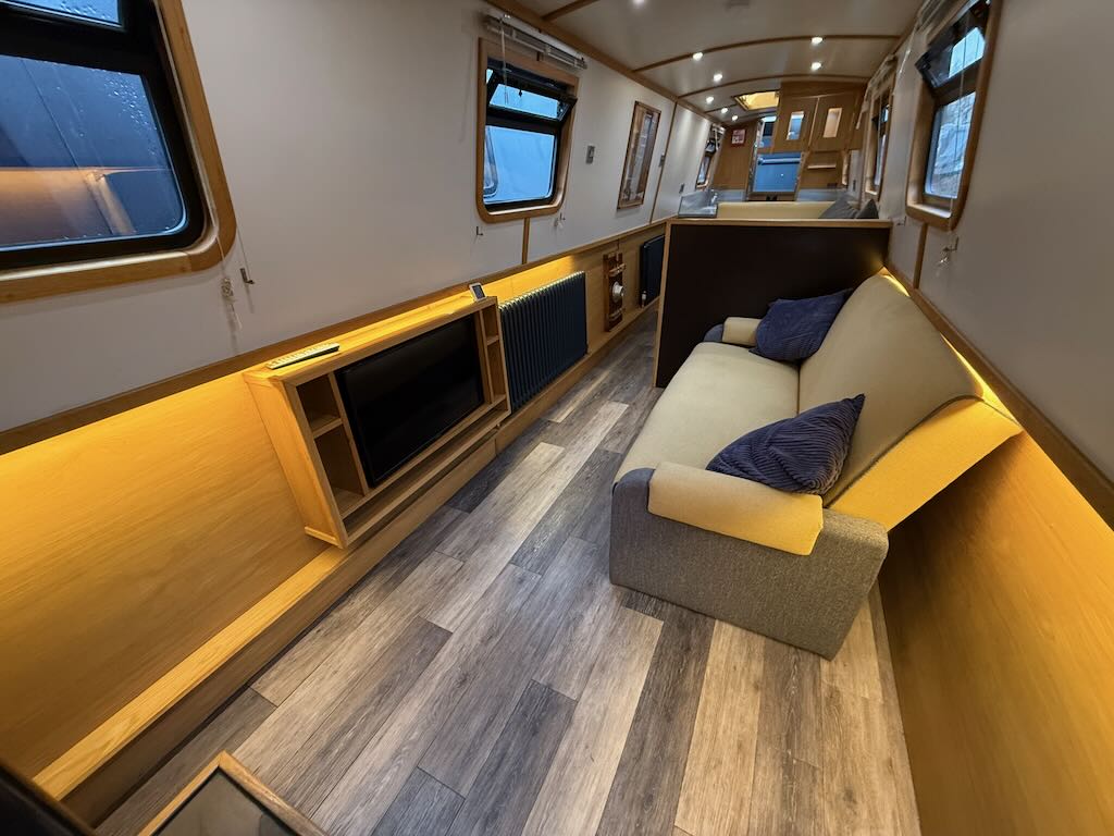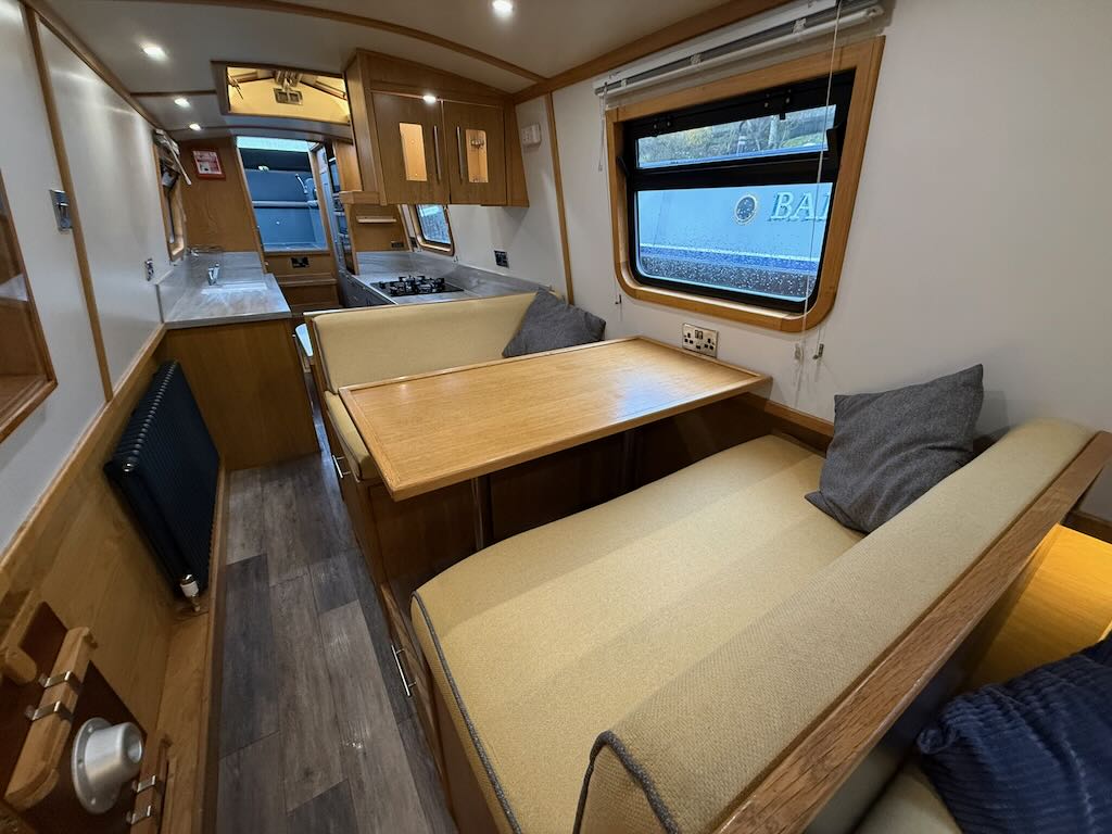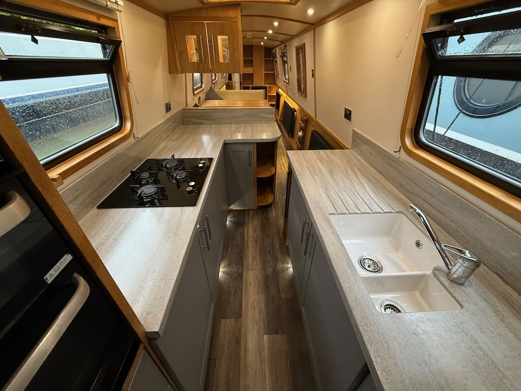 Old Wyle is a 6 berth, 62ft cruiser style narrowboat, built in 2021 by Bluewater Boats. She features a reverse layout with the galley at the stern, a dinette that converts to double bed, saloon with sofa bed and stove, walkthrough bathroom with shower, toilet and vanity basin and a cross double bed a the bow.