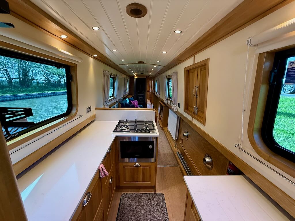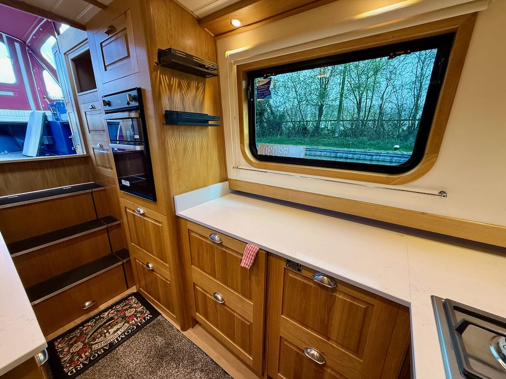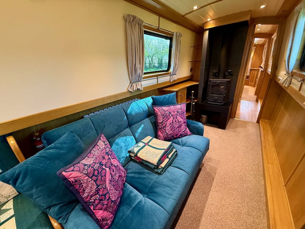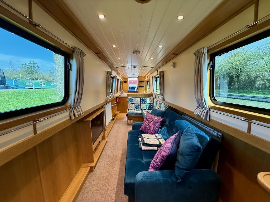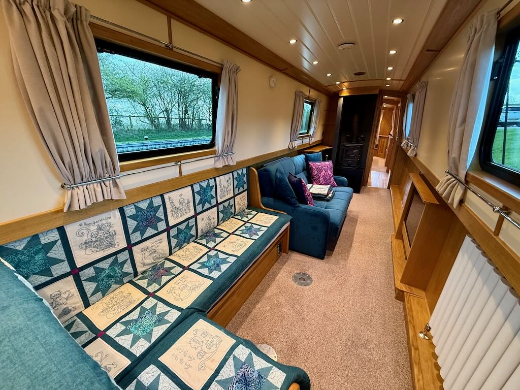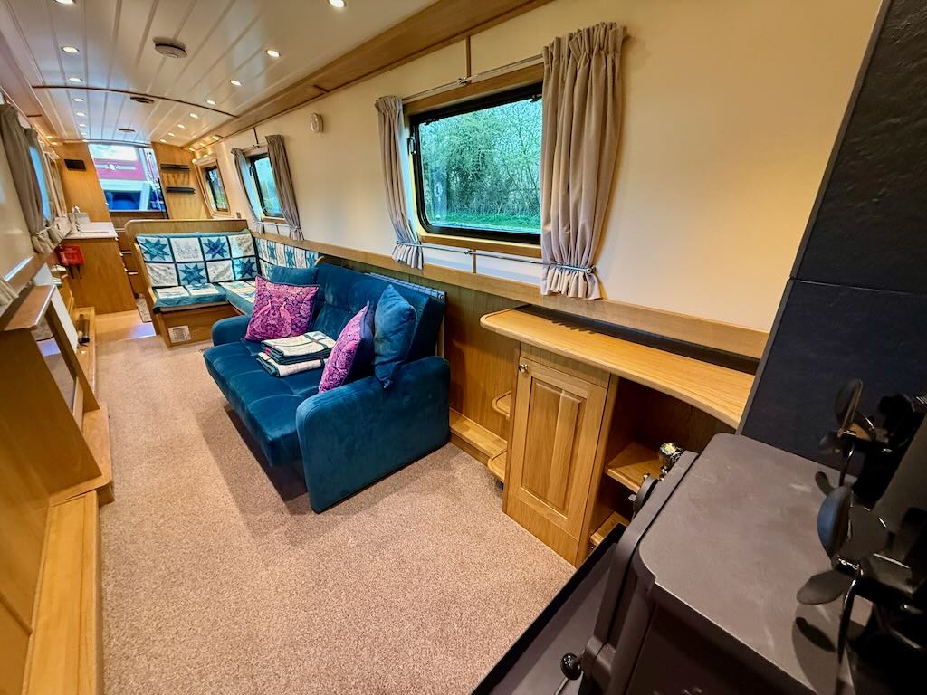 Just Purrrfect is a stunning 6 berth, cruiser style narrowboat, built in 2024 by Collingwood. She features a reverse layout with the galley, with oven, hob, microwave, washing machine and fridge, at the stern, saloon with L-shaped dinette that converts to double bed, sofa bed and stove, walkthrough bathroom with shower, compost toilet and vanity basin, and cross double bed at the bow. The boat comes with a wealth of extras such as a TV, a full set of un-tinted window glass, Digi Pro plus TV antenna, Nest thermostat control, spare compost fluid bottles, river anchor and more.
