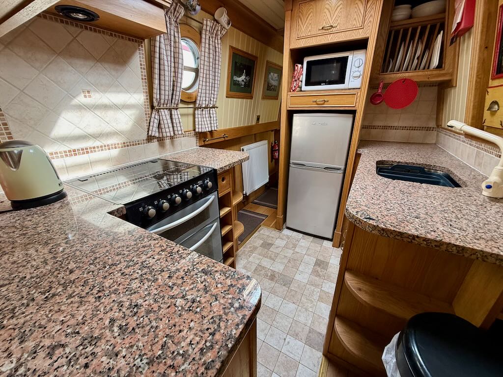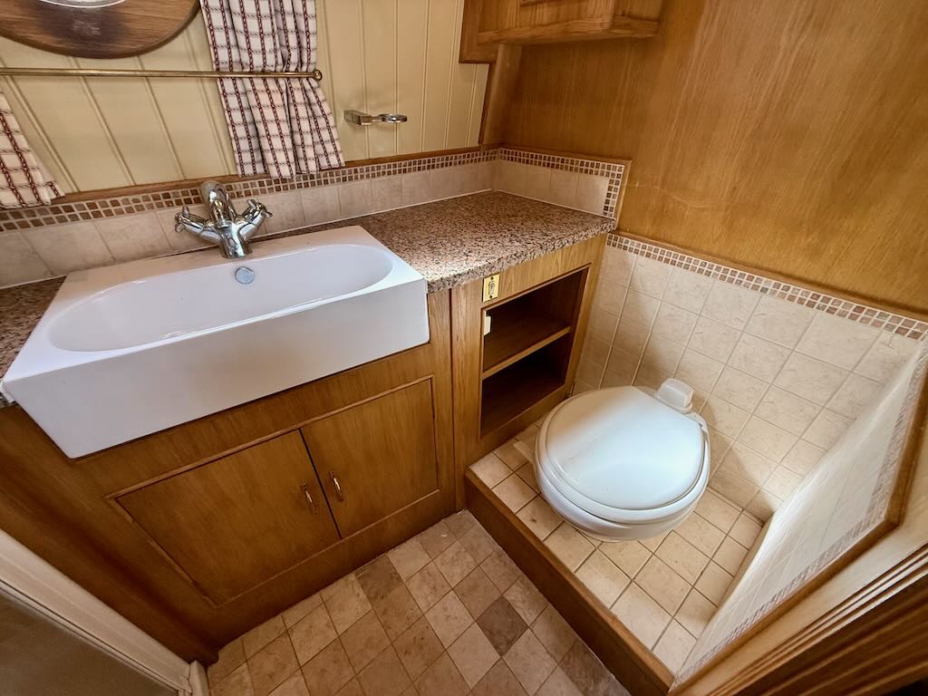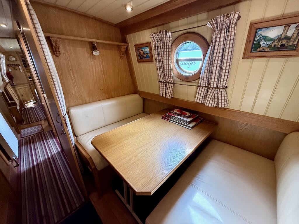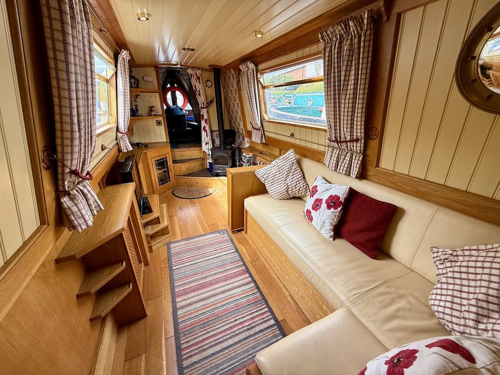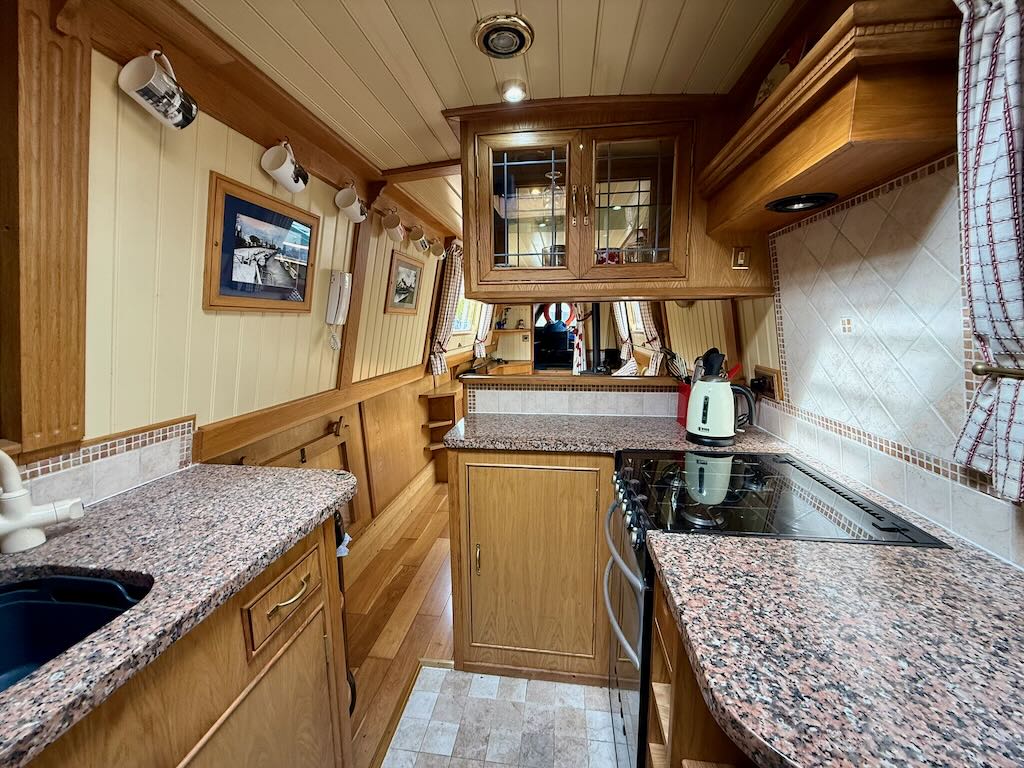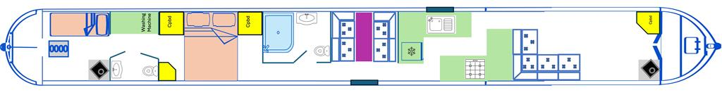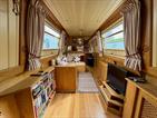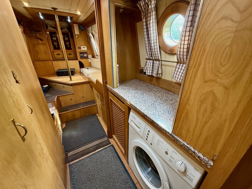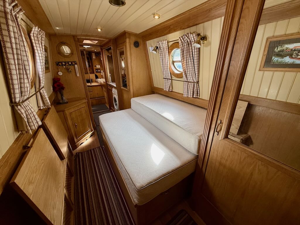Chartwell is a lovely 7 berth, 69ft traditional style narrowboat, built in 2007 by Steve Emery. She features a saloon with stove and L-shaped seating that converts to a double bed, galley with oven, hob, fridge freezer and microwave, dinette that converts to a double bed, bathroom with shower, pumpout toilet and vanity basin, bedroom with cross double bed, utility area with second cassette toilet, vanity basin and washing machine, and a back cabin with seating that can be used as another single bed.